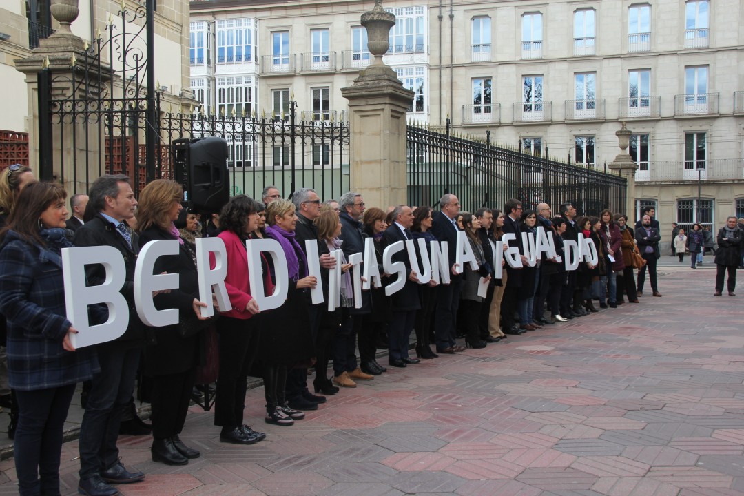 En Gasteiz, en primera fila de la concentración, portando unas letras en las que se podía leer “Berdintasuna-Igualdad”, se encontraba el presidente del ABB, José Antonio Suso; el portavoz del grupo parlamentario, Joseba Egibar; los y las diputadas que componen el ejecutivo foral, encabezado por Ramiro González, así como los y las concejalas del equipo de gobierno municipal gasteiztarra junto al alcalde gasteiztarra, Gorka Urtaran. Les acompañaban también las consejeras del Gobierno Vasco, Beatriz Artolazabal, Estefanía Beltrán de Heredia y Cristina Uriarte. La concentración, celebrada frente a las puertas del Parlamento Vasco, ha reunido a más de 80 cargos internos e institucionales de EAJ-PNV. A su término, la presidenta del Parlamento Vasco, Bakartxo Tejería, ha leído la declaración.
