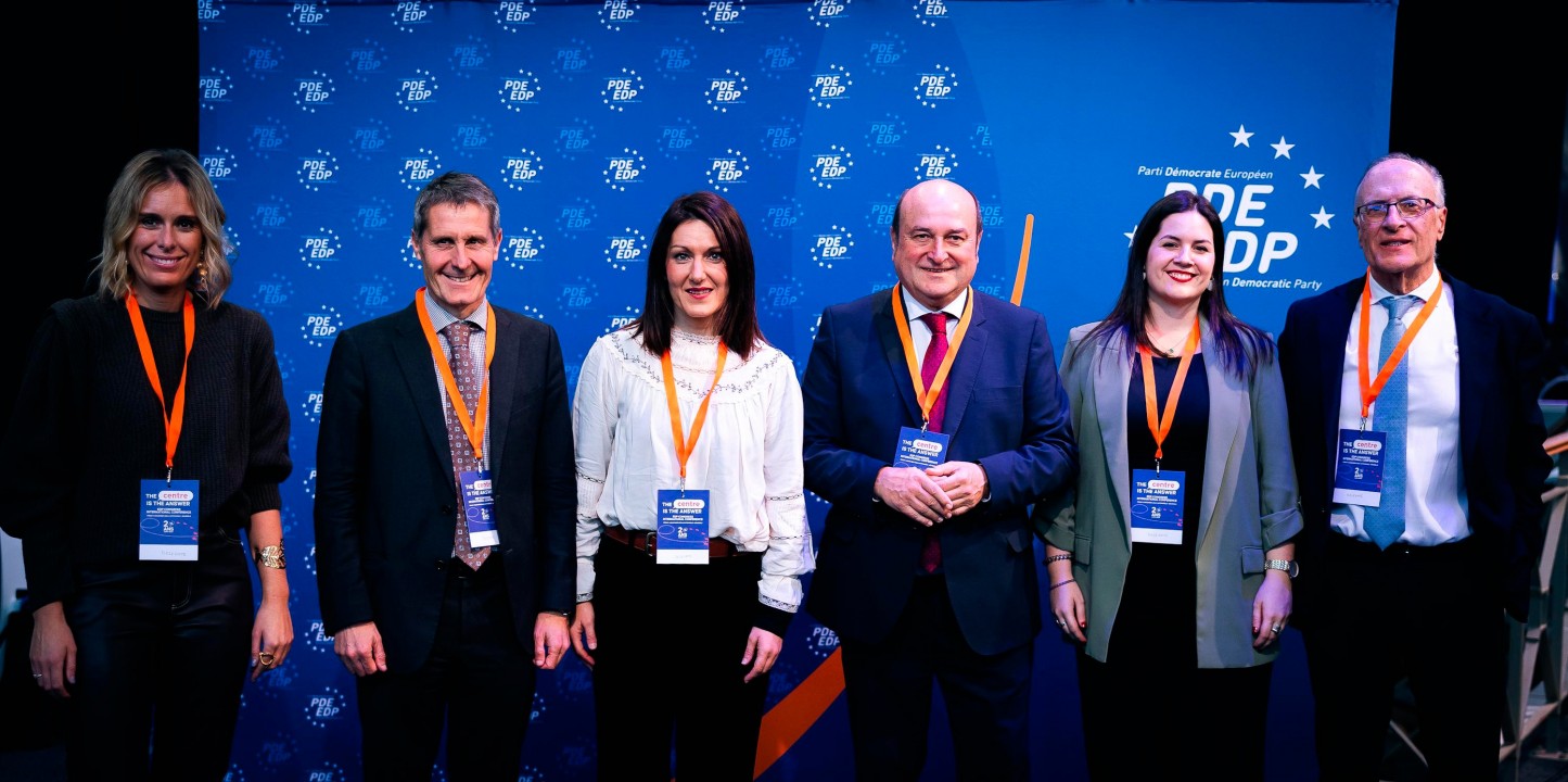 El presidente del Euzkadi Buru Batzar y vicepresidente del PDE, Andoni Ortuzar, ha encabezado la delegación jeltzale que hoy, viernes 6 de diciembre, ha asistido al encuentro político que el Partido Demócrata Europeo (PDE) ha organizado en el Autoworld de Bruselas, en pleno Parque del Cincuentenario, para celebrar el 20º aniversario de su constitución. EAJ-PNV es miembro fundador del PDE. Ortuzar se ha desplazado a la capital europea junto con el burukide responsable del Área de Acción Exterior, Mikel Burzako; la eurodiputada de EAJ-PNV, Oihane Agirregoitia; la secretaria del Euzkadi Buru Batzar, Mireia Zarate; la número 2 en la lista de EAJ-PNV en las Elecciones Europeas del 9 de junio, Aitana Agirre; y el secretario adjunto del PDE y referente histórico de la Acción Exterior de EAJ-PNV, José Mari Etxebarria. Bajo el lema ‘The centre is the answer’ (‘El centro es la respuesta’), el PDE ha conmemorado su efeméride con un acto en cuyo transcurso ha dado a conocer su nuevo logo, que pasa a estar presidido por la palabra ‘Democrats’ y que añade a su ya clásico azul europeísta el color naranja.