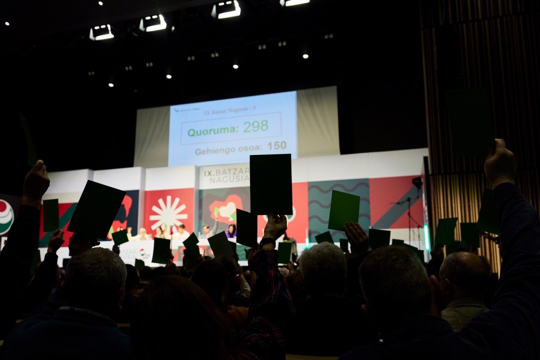 El discurso de Esteban ha echado el cierre a la IX Asamblea General de la formación jeltzale, que ha celebrado en el Palacio Europa de Gasteiz su segunda y última sesión para aprobado los nuevos Estatutos Nacionales para fortalecer y activar a la militancia, tras la llevada a cabo en el Atano III de Donostia en marzo. Fue precisamente aquella primera sesión la que nombró a Aitor Esteban presidente del EBB de EAJ-PNV.